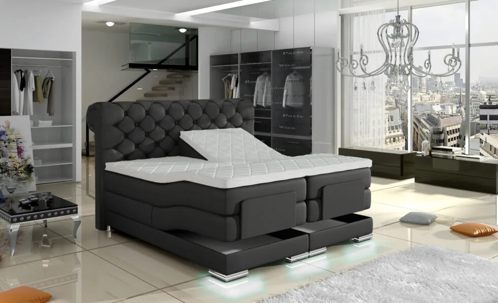 De ROYAL ELEKTRO 2809 wordt als compleet geheel geleverd, inclusief matrassen, hoofdbord en potenset. U kunt kiezen uit verschillende afmetingen en een breed scala aan stoffen en lederlook kleuren, zodat u de boxspring perfect kunt afstemmen op uw persoonlijke voorkeur en interieur.