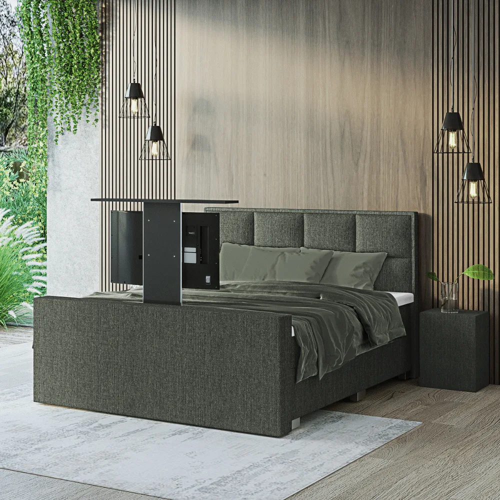 Ervaar het ultieme kijkplezier vanuit uw bed met de Royalelectro + TV lift 55. Deze luxe boxspring combineert stijlvol design met ongeëvenaard comfort en is bekleed met hoogwaardige meubelstof. Met de draadloze afstandsbediening laat u eenvoudig uw TV verschijnen en verdwijnen vanuit het elegante voetbord. Een perfecte combinatie van gemak en luxe!